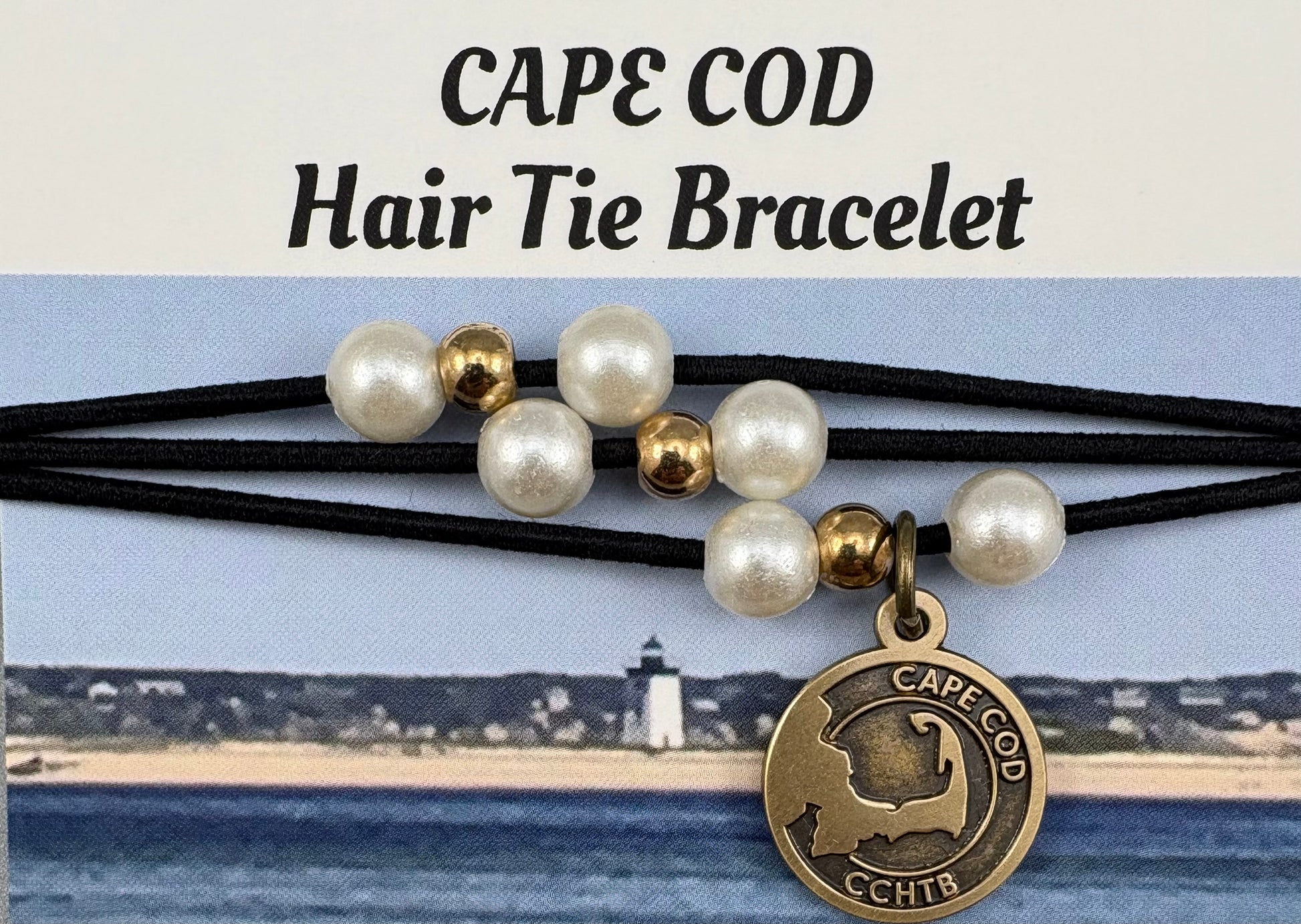 Brewster Barnacle Black - Crafted in Dennis MA. Three large, comfy, stretchy acrylic elastic bands joined together to form one. Designed with nine round beads - six white and three gold tone color. Finished with a beautiful round, antique brass charm, double sided design of the quintessential Cape Cod outline. Dual functionality wear as a Hair Tie or a Stunning Bracelet. Great for gifts, Birthdays, Christmas stocking stuffers, bridesmaids, teachers, teens, best friends and a great Cape Cod Souvenir!