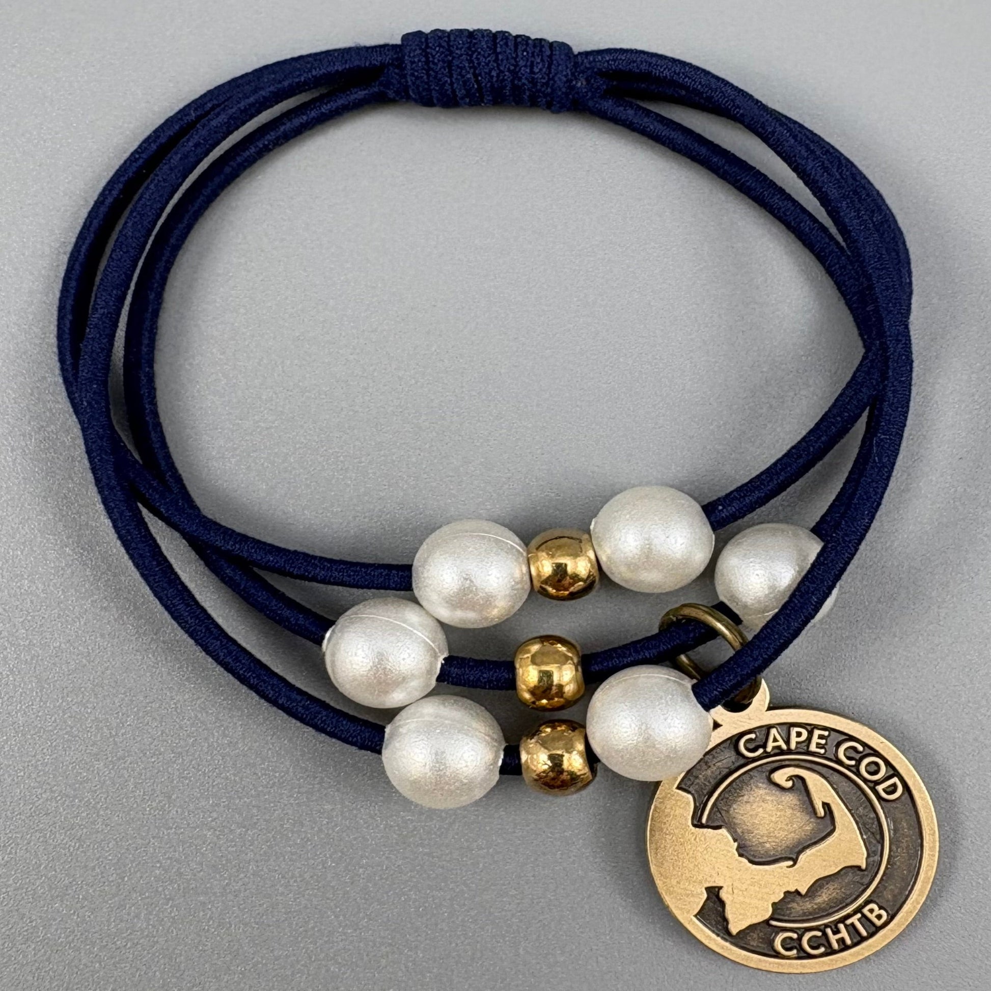 Dennis Dark Denim - Crafted in Dennis MA. Three large, comfy, stretchy acrylic elastic bands joined together to form one. Designed with nine round beads - six white and three gold tone color. Finished with a beautiful round, antique brass charm, double sided design of the quintessential Cape Cod outline. Dual functionality wear as a Hair Tie or a Stunning Bracelet. Great for gifts, Birthdays, Christmas stocking stuffers, bridesmaids, teachers, teens, best friends and a great Cape Cod Souvenir!